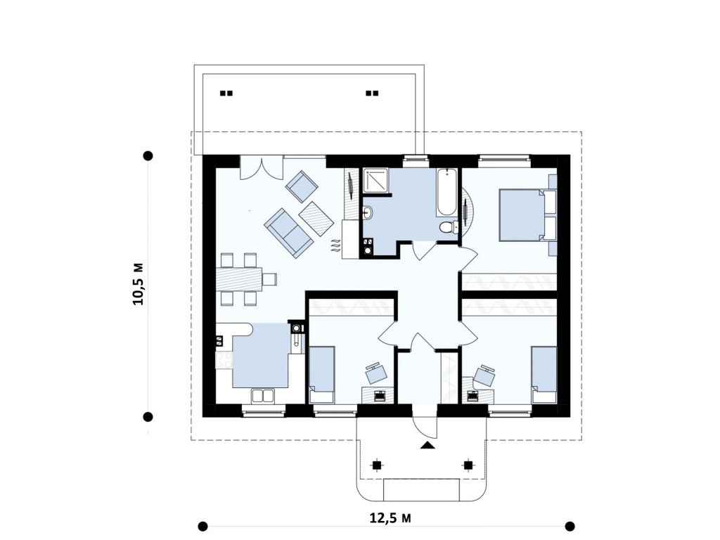 - Pôdorysné rozmery (čistá vnútorná plocha): 10,5 x 12,5 m