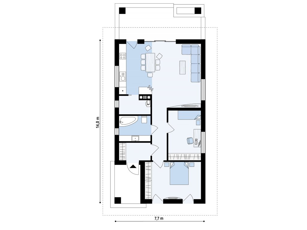 - Pôdorysné rozmery (čistá vnútorná plocha): 14 x 7,7 m